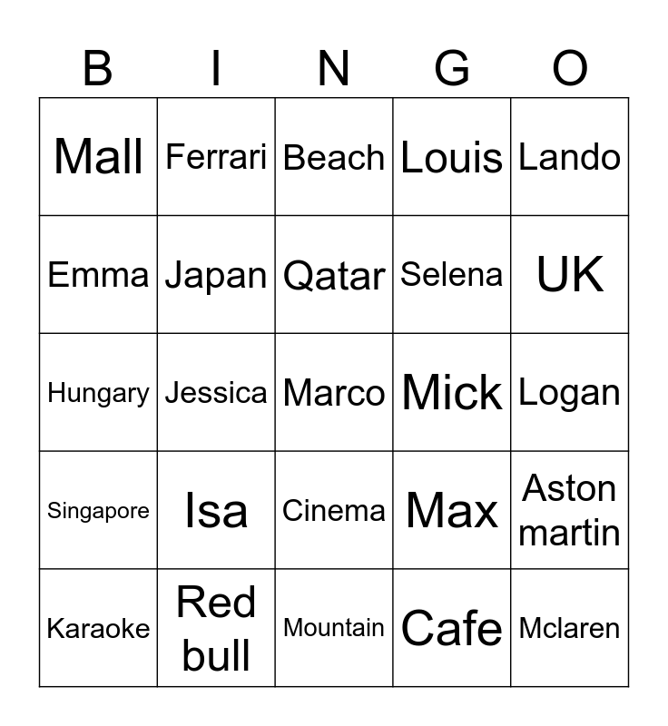 This bingo card has 25 words: Isa, Mountain, Qatar, Karaoke, Lando, Mall, Emma, Ferrari, Mick, Cinema, Selena, Hungary, Max, Aston martin, Japan, Mclaren, Logan, Beach, UK, Jessica, Marco, Red bull, Singapore, Louis and Cafe.