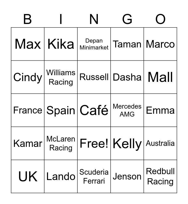 This bingo card has 26 words: Free!, Jenson, Russell, Lando, Marco, Max, Cindy, Kika, Emma, Kelly, Dasha, France, Australia, UK, Spain, Italy, Taman, Kamar, Depan Minimarket, Café, Mall, Scuderia Ferrari, Mercedes AMG, McLaren Racing, Williams Racing and Redbull Racing.