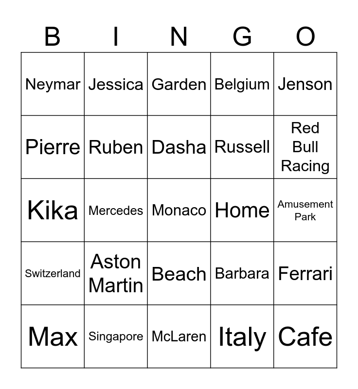 This bingo card has 25 words: Aston Martin, McLaren, Dasha, Max, Jenson, Neymar, Pierre, Jessica, Home, Beach, Russell, Kika, Barbara, Ferrari, Ruben, Cafe, Amusement Park, Garden, Red Bull Racing, Mercedes, Monaco, Singapore, Switzerland, Belgium and Italy.