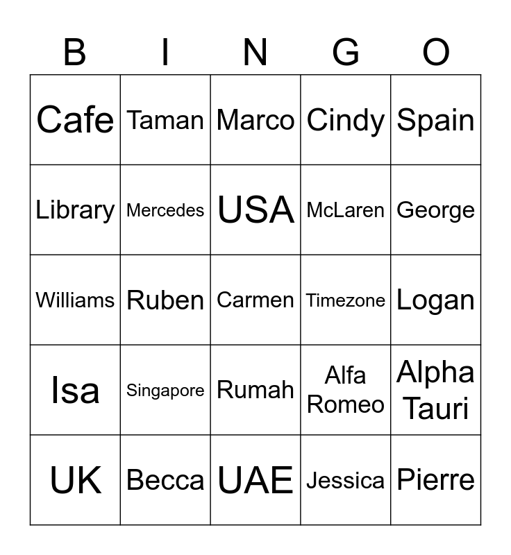 This bingo card has 25 words: Singapore, UAE, USA, UK, Spain, Cafe, Library, Taman, Timezone, Rumah, McLaren, Williams, Alfa Romeo, Alpha Tauri, Mercedes, Pierre, Logan, Marco, George, Ruben, Carmen, Becca, Isa, Cindy and Jessica.