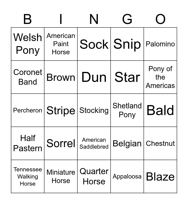 This bingo card has a free space and 38 words: Free!, Black, Bay, Brown, Chestnut, Sorrel, Dun, Grey, Palomino, Star, Stripe, Snip, Blaze, Bald, Coronet Band, Half Pastern, Pastern, Sock, Heel, Shetland Pony, Welsh Pony, Miniature Horse, Pony of the Americas, Tennessee Walking Horse, Thoroughbred, Quarter Horse, Standardbred, Palomino, Pinto, Arabian, Morgan, American Saddlebred, Appaloosa, American Paint Horse, Clydesdale, Belgian, Percheron and Shire.