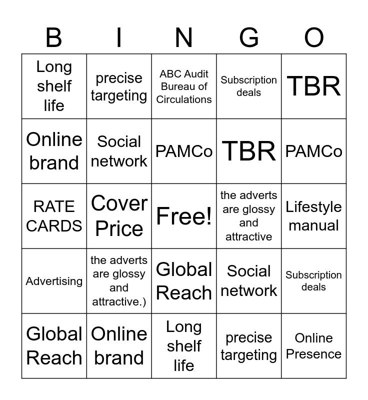 This bingo card has a free space and 35 words: Cover Price, Advertising, Online Presence, Social network, Global Reach, Subscription deals, Online brand, ABC Audit Bureau of Circulations, PAMCo, Media Packs, RATE CARDS, TBR, Lifestyle manual, Non-intrusive, Long shelf life, the adverts are glossy and attractive, precise targeting, Cover Price, Advertising, Online Presence, Social network, Global Reach, Subscription deals, Online brand, ABC Audit Bureau of Circulations, PAMCo, Media Packs, RATE CARDS, TBR, Lifestyle manual, Non-intrusive, Long shelf life, the adverts are glossy and attractive.), precise targeting and ABC1 male aspirers.