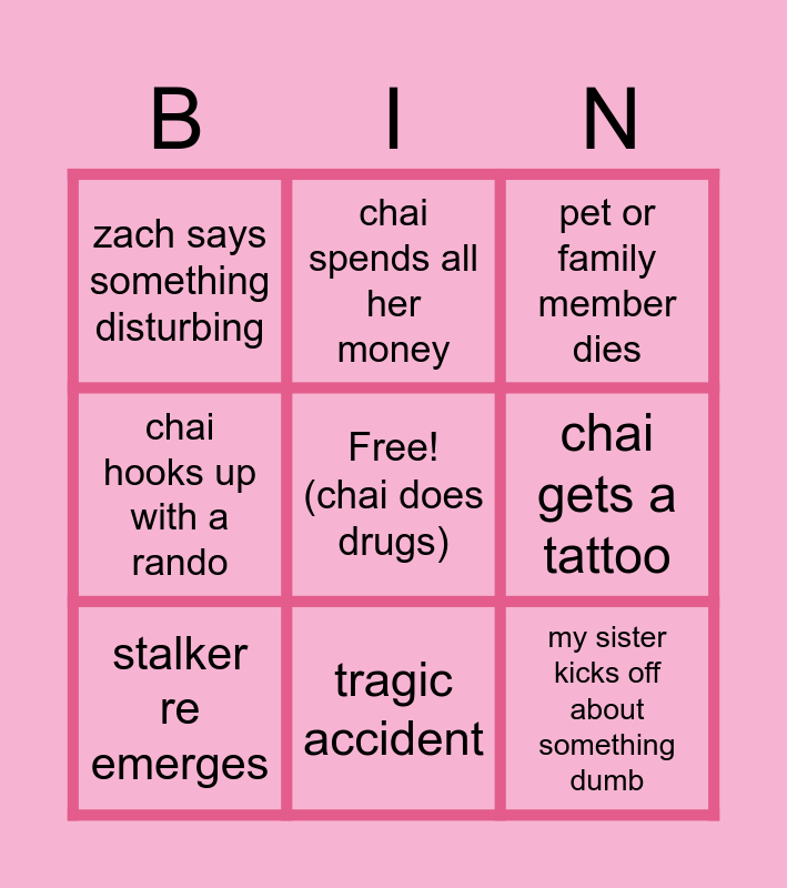 This bingo card has a free space and 17 words: medical emergancy, asian randy gets drunk, pet or family member dies, zach says something disturbing, chai loses something important, chai hooks up with a rando, chai changes her hair colour, stalker re emerges, tragic accident, chai gets a tattoo, someone gets arrested, luggage lost, my sister kicks off about something dumb, chai spends all her money, chai is manic, chai is depressed and asian randy goes loopy.