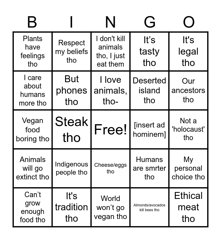 This bingo card has a free space and 70 words: But lions tho, Not a 'holocaust' tho, It's natural tho, If happy animals tho, It's tradition tho, My protein tho, It’s tasty tho, Stepping on bugs tho, It's legal tho, Unrealistic analogy tho, My personal choice tho, Humans are omnivores tho, Plants have feelings tho, I don't kill animals tho, I just eat them, Bacon tho, Steak tho, Cheese/eggs tho, Deserted island tho, Animals will overpopulate tho, Animals will go extinct tho, [insert ad hominem], Humans are smrter tho, Our ancestors tho, I was vegan before tho, Vegan food have chemicals tho, I need meat to live tho, For thousands of years tho, Crop deaths tho, Almonds/avocados kill bees tho, But most people tho, Respect my beliefs tho, Soy has estrogen tho, No B12 tho, Vegans support abortion tho, Food chain tho, Hitler was a vegetarian tho, Circle of life tho, So expensive tho, God/religion tho, I care about humans more tho, Vegans are pale/skinny tho, Indigenous people tho, Ethical meat tho, Meat gave us brain tho, Why no care about people tho, But phones tho, Can’t grow enough food tho, Preachy vegans tho, But PETA tho, Wool is okay tho, Canine teeth tho, Fish ain’t meat tho, What else animals for tho, Honey is vegan tho, World won’t go vegan tho, One person no difference tho, I love animals, tho-, I hunt tho, Animals still die tho, Humans first tho, Vegan food boring tho, I honor the animals tho, Vegan parents are abusive tho, Vegan cat/dog food is abuse tho, Cows need to be milked tho, Wait for lab meat tho, Bred for a purpose tho, Morality is subjective tho, Losing jobs tho and Veganism is a cult tho.