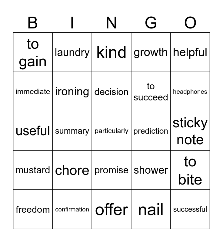 This bingo card has a free space and 24 words: chore, confirmation, decision, freedom, helpful, to gain, immediate, laundry, prediction, promise, to succeed, useful, shower, to bite, ironing, nail, sticky note, kind, headphones, summary, successful, mustard, growth and offer.