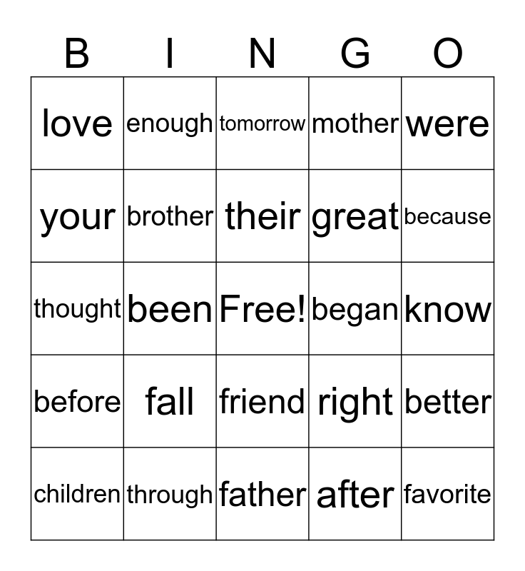 This bingo card has a free space and 24 words: fall, through, their, children, were, love, your, enough, began, friend, great, thought, right, better, brother, after, know, tomorrow, because, been, favorite, before, mother and father.