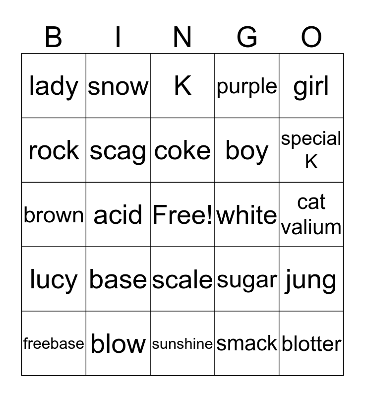 This bingo card has a free space and 24 words: base, blow, coke, freebase, girl, lady, rock, snow, white, scale, boy, brown, sugar, jung, scag, smack, cat valium, K, special K, acid, blotter, lucy, purple and sunshine.