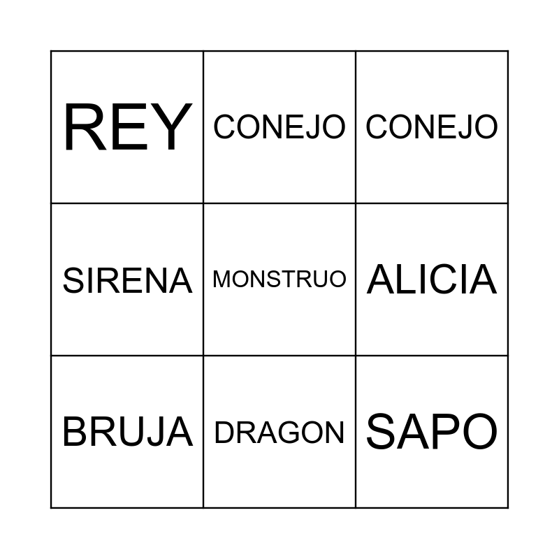This bingo card has a free space and 14 words: SAPO, REINA, BRUJA, CONEJO, SIRENA, SAPO, HADA, PRINCESA, DRAGON, REY, ESCOBA, ALICIA, CONEJO and BRUJO.
