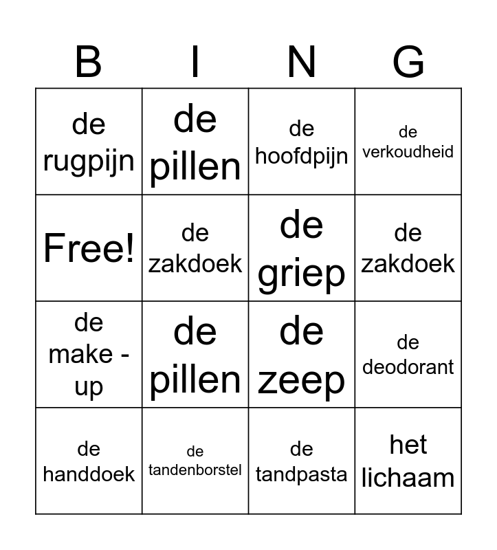 This bingo card has 16 words: de tandenborstel, de deodorant, de hoofdpijn, de rugpijn, de make -up, de pillen, de zeep, de tandpasta, Free!, de zakdoek, de handdoek, de verkoudheid, de pillen, de zakdoek, de griep and het lichaam.
