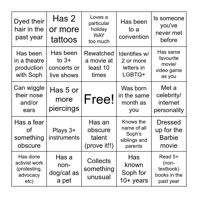 This bingo card has a free space and 24 words: Plays 3+ instruments, Has a non-dog/cat as a pet, Rewatched a movie at least 10 times, Has done activist work (protesting, advocacy etc), Is someone you've never met before, Dyed their hair in the past year, Has been in a theatre production with Soph, Has 2 or more tattoos, Was born in the same month as you, Has an obscure talent (prove it!!), Identifies w/ 2 or more letters in LGBTQ+, Can wiggle their nose and/or ears, Knows the name of all Soph's siblings and parents, Dressed up for the Barbie movie, Has been to 3+ concerts or live shows, Has known Soph for 10+ years, Met a celebrity/ internet personality, Loves a particular holiday WAY too much, Has same favourite movie/ video game as you, Has 5 or more piercings, Read 5+(non-textbook) books in the past year, Has a fear of something obscure, Has been to a convention and Collects something unusual.