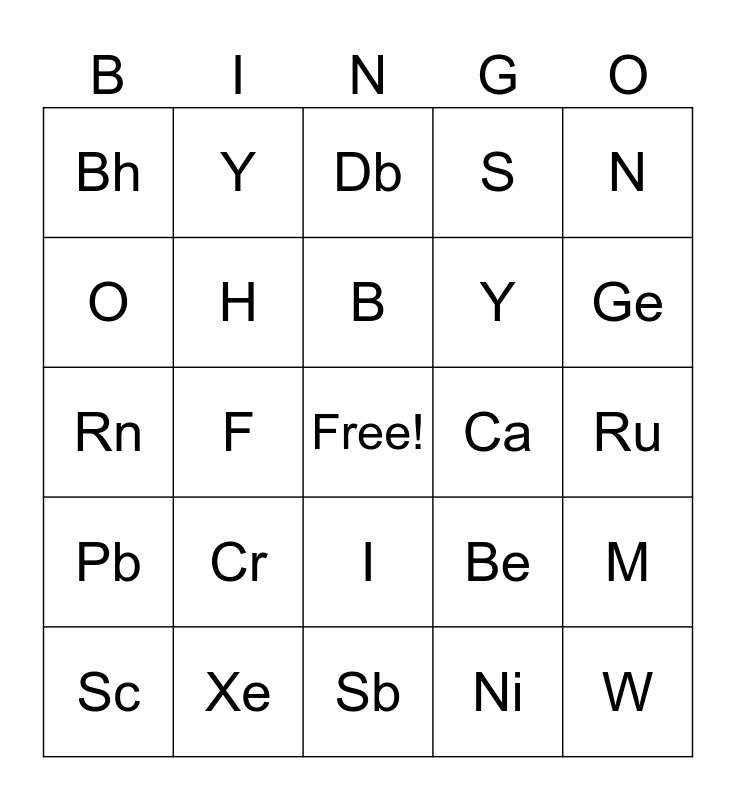 This bingo card has a free space and 29 words: Sc, Au, F, Hg, Bh, Db, H, Cr, Ca, Xe, Ru, W, Sb, Ni, Ge, Os, I, Pb, N, Rn, Be, Rf, Y, O, S, Y, M, B and O.