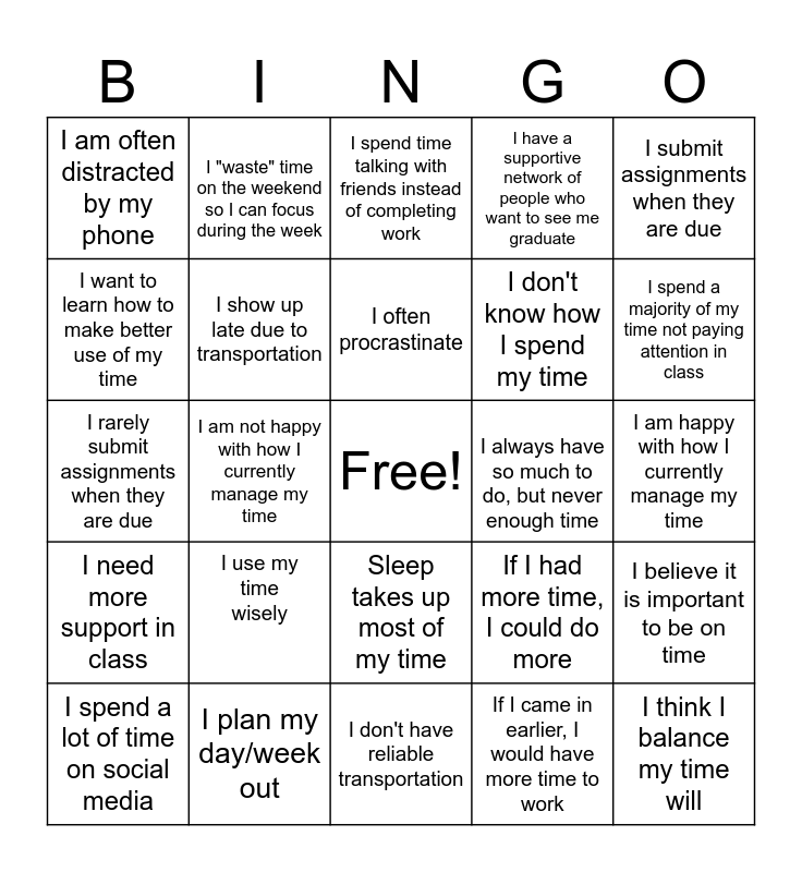 This bingo card has a free space and 24 words: I use my time wisely, I plan my day/week out, I often procrastinate, I spend a lot of time on social media, I submit assignments when they are due, I am often distracted by my phone, I want to learn how to make better use of my time, I "waste" time on the weekend so I can focus during the week, I always have so much to do, but never enough time, Sleep takes up most of my time, I don't know how I spend my time, I rarely submit assignments when they are due, If I had more time, I could do more, I believe it is important to be on time, I show up late due to transportation, If I came in earlier, I would have more time to work, I am happy with how I currently manage my time, I spend time talking with friends instead of completing work, I spend a majority of my time not paying attention in class, I am not happy with how I currently manage my time, I think I balance my time will, I need more support in class, I have a supportive network of people who want to see me graduate and I don't have reliable transportation.