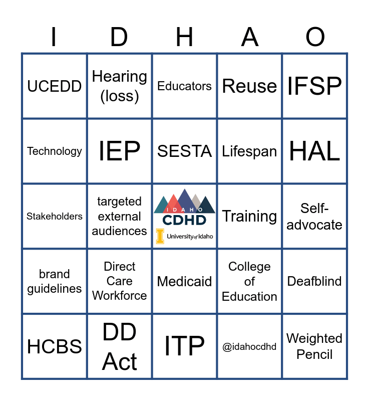 This bingo card has a free space and 32 words: @idahocdhd, marketing material, targeted external audiences, content strategies, brand guidelines, IEP, IFSP, Deafblind, Hearing (loss), Vision (loss), SESTA, Educators, Outcomes, Students, Training, Support, HCBS, Stakeholders, Medicaid, Direct Care Workforce, College of Education, DANI, Self-advocate, DD Act, Weighted Pencil, Reuse, Lifespan, Technology, UCEDD, ITP, QoL and HAL.