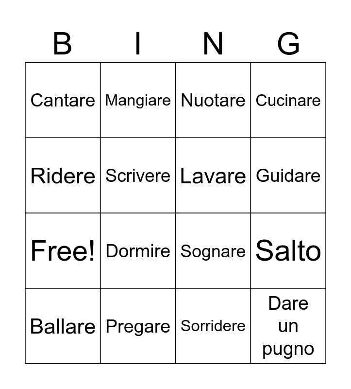 This bingo card has 20 words: Salto, Correre, Nuotare, Andare in Bici, Ballare, Ridere, Pregare, Cantare, Free!, Mangiare, Dormire, Sognare, Scrivere, Dare un pugno, Lavare, Volare, Guidare, Cucinare, Sorridere and Accigliarsi.