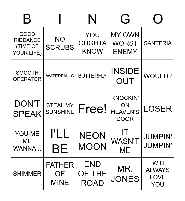 This bingo card has a free space and 49 words: NOTHING COMPARES 2 U, I WILL ALWAYS LOVE YOU, EVERYBODY HURTS, END OF THE ROAD, I'LL BE, LINGER, NO SCRUBS, SAY MY NAME, SMOOTH OPERATOR, GETTIN' JIGGY WIT IT, WATERFALLS, MY OWN WORST ENEMY, JUMPIN' JUMPIN', IT WASN'T ME, READY OR NOT, KISS ME, BUTTERFLY, KNOCKIN' ON HEAVEN'S DOOR, GENIE IN A BOTTLE, SANTERIA, STEAL MY SUNSHINE, MR. JONES, GOOD RIDDANCE (TIME OF YOUR LIFE), INSIDE OUT, DOO WOP, WOULD?, SHIMMER, DRIVE, NEON MOON, YOU ME ME WANNA..., SMELLS LIKE TEEN SPIRIT, BLACK HOLE SUN, FAR BEHIND, ALL FOR YOU, FATHER OF MINE, ONLY WANNA BE WITH YOU, ONE HEADLIGHT, SELF ESTEEM, LOSER, PEACHES, FLY AWAY, YOU DON'T KNOW HOW IT FEELS, CUMBERSOME, JANE SAYS, DON'T SPEAK, YOU OUGHTA KNOW, CHAMPAGNE SUPERNOVA, CLOSING TIME and BIG EMPTY.
