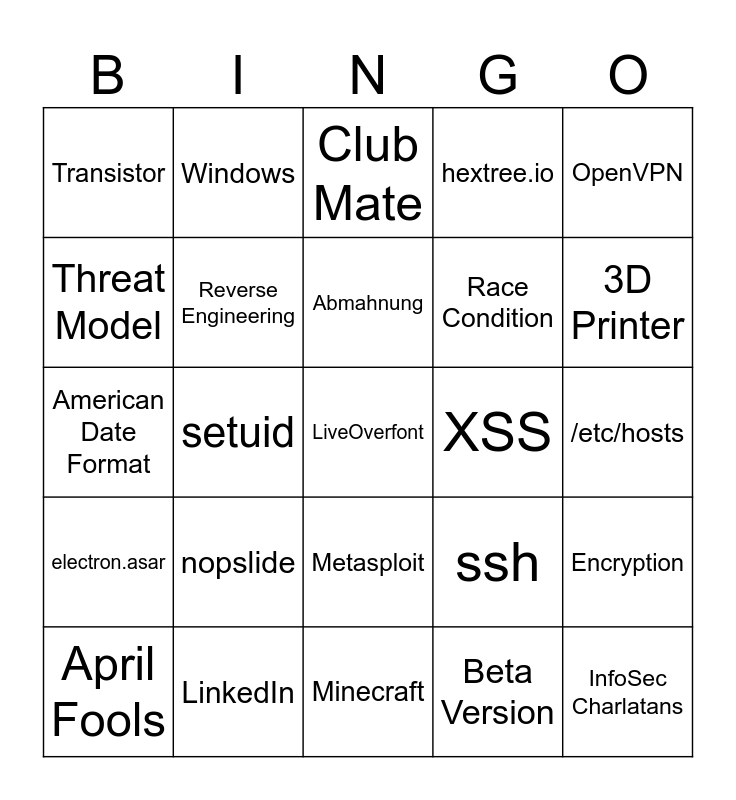 This bingo card has 25 words: nopslide, Minecraft, Abmahnung, April Fools, OpenVPN, Transistor, Threat Model, Windows, XSS, Metasploit, Race Condition, American Date Format, ssh, Encryption, Reverse Engineering, InfoSec Charlatans, /etc/hosts, Club Mate, 3D Printer, setuid, LiveOverfont, LinkedIn, electron.asar, hextree.io and Beta Version.
