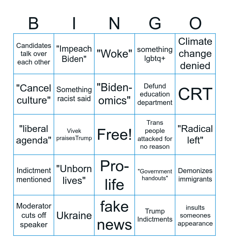 This bingo card has a free space and 24 words: Moderator cuts off speaker, "Unborn lives", "Biden-omics", Trump Indictments, Climate change denied, Candidates talk over each other, "Impeach Biden", "Woke", Trans people attacked for no reason, "Radical left", "liberal agenda", Something racist said, "Government handouts", Demonizes immigrants, "Cancel culture", Ukraine, fake news, something lgbtq+, CRT, Indictment mentioned, Vivek praisesTrump, Pro-life, Defund education department and insults someones appearance.