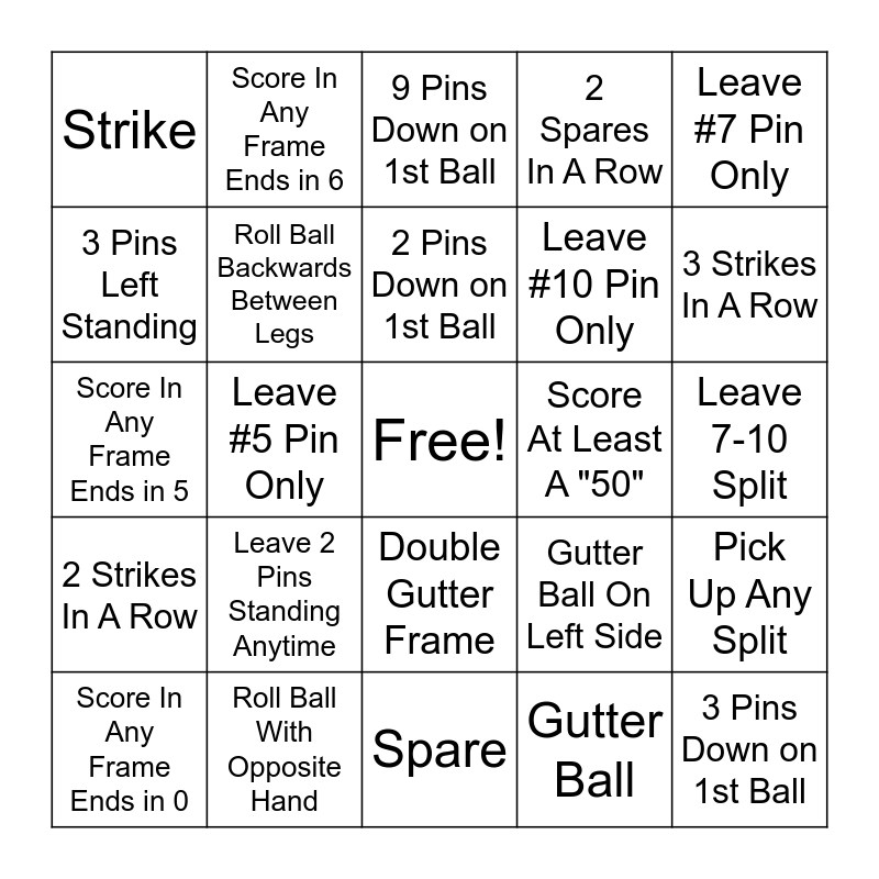 This bingo card has a free space and 25 words: Leave 2 Pins Standing Anytime, Spare, 2 Pins Down on 1st Ball, Score In Any Frame Ends in 0, Leave #7 Pin Only, Strike, 3 Pins Left Standing, Score In Any Frame Ends in 6, Score At Least A "50", Double Gutter Frame, Leave #10 Pin Only, Score In Any Frame Ends in 5, Gutter Ball On Left Side, Pick Up Any Split, Roll Ball Backwards Between Legs, Gutter Ball On Right Side, Leave 7-10 Split, 9 Pins Down on 1st Ball, 3 Strikes In A Row, Leave #5 Pin Only, 3 Pins Down on 1st Ball, Roll Ball With Opposite Hand, 2 Strikes In A Row, 2 Spares In A Row and Gutter Ball.