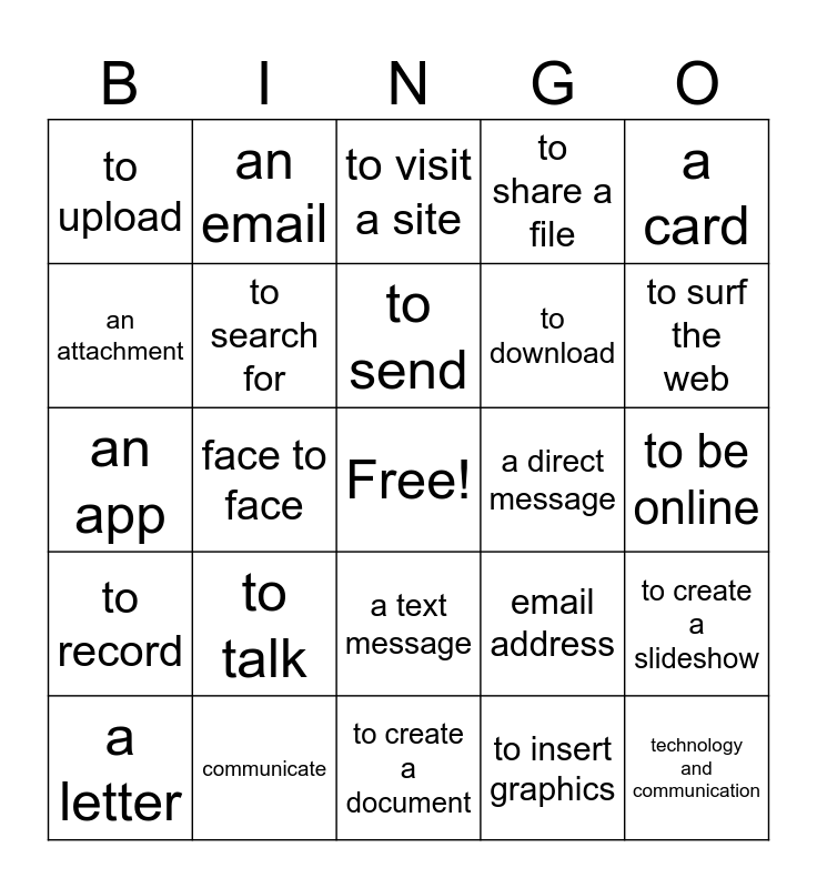 This bingo card has a free space and 24 words: to talk, communicate, to send, a letter, a card, to upload, an attachment, an email, a direct message, a text message, to download, an app, email address, to create a slideshow, to search for, to insert graphics, to be online, to visit a site, to surf the web, face to face, technology and communication, to record, to share a file and to create a document.