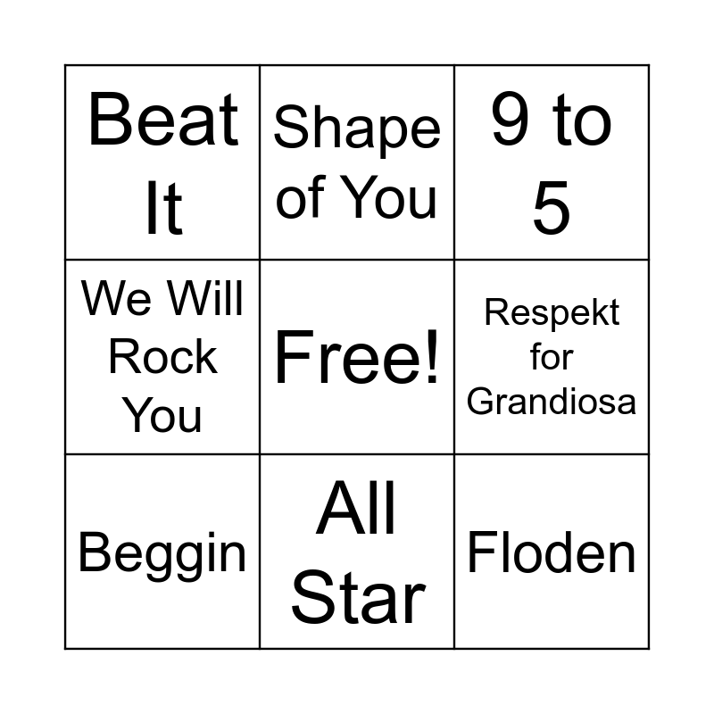 This bingo card has a free space and 14 words: Let It Be, The Real Slim Shady, Beggin, Shape of You, We Will Rock You, Floden, Badebussen, Can´t Hold Us, All Star, Beat It, The Nights, Respekt for Grandiosa, 9 to 5 and Hvite menn som pusher 50.