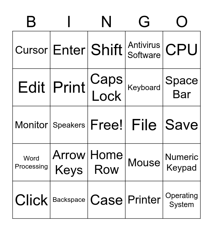 This bingo card has a free space and 24 words: Arrow Keys, Backspace, Caps Lock, Click, CPU, Cursor, Edit, Enter, File, Home Row, Keyboard, Monitor, Mouse, Numeric Keypad, Print, Printer, Save, Shift, Space Bar, Speakers, Operating System, Word Processing, Antivirus Software and Case.