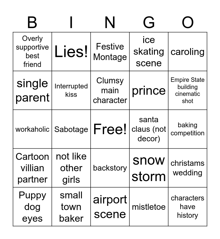This bingo card has a free space and 33 words: Jingle bell rock @ title screen, grinch, Sabotage, coco, Cartoon villian partner, Interrupted kiss, caroling, Puppy dog eyes, Lies!, decorating the tree, Clumsy main character, Festive Montage, Lone wolf, motivational speech, santa claus (not decor), Empire State building cinematic shot, small town baker, workaholic, not like other girls, snow storm, backstory, deadline, Overly supportive best friend, baking competition, airport scene, characters have history, ice skating scene, prince, single parent, christams wedding, Empire state building cinematic shot, mistletoe and christmas name (Nick, Holly, etc.).