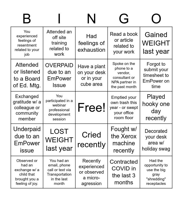 This bingo card has a free space and 29 words: Observed or had an exchange w/ a child that brought you a feeling of joy., Used mindfulness techniques or Yoga stretches during the work day, You participated in a webinar professional development session, you endured a lengthy IEP, You experienced feelings of resentment related to your job, Had feelings of exhaustion, OVERPAID due to an EmPower Issue, LOST WEIGHT last year, Emptied your own trash this year - or swept your office room floor, You had an email, phone call or text via Transportation in the last month, Played hooky one day recently, Had the opportunity to use the big gray "shredding" receptacles, Recently experienced or observed a micro-agression, Contracted COVID in the last 3 months, Forgot to submit your timesheet to EmPower on time, Said a cuss/swear word OUT LOUD!, Cried recently, Underpaid due to an EmPower issue, Gained WEIGHT last year, Exchanged gratitude w/ a colleague or community member, Fought w/ the Xerox machine recently, Covered/ing a vacancy either in a school or on our SpEd Central team, Spoke on the phone to a vendor, consultant or NPA partner in the past month, Attended or listened to a Board of Ed. Mtg., Read a book or article related to your work, Attended an off site training related to work, Decorated your desk area w/ holiday swag, Have a plant on your desk or in your cube area and Have an ergonomic chair.