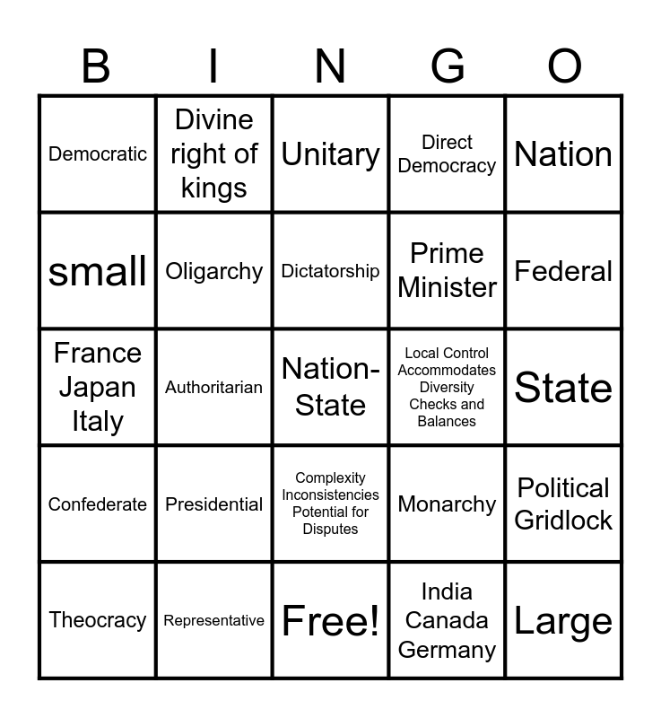This bingo card has 25 words: Confederate, Representative, Nation- State, India Canada Germany, Nation, Democratic, Divine right of kings, Unitary, Local Control Accommodates Diversity Checks and Balances, Political Gridlock, small, Oligarchy, Free!, Monarchy, Federal, Theocracy, Authoritarian, Dictatorship, Prime Minister, State, France Japan Italy, Presidential, Complexity Inconsistencies Potential for Disputes, Direct Democracy and Large.