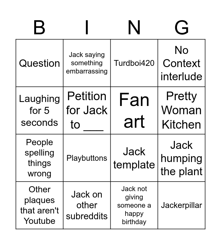 This bingo card has 16 words: Jack on other subreddits, Jack humping the plant, Turdboi420, Question, People spelling things wrong, Jack saying something embarrassing, Jack template, Jack not giving someone a happy birthday, Laughing for 5 seconds, Petition for Jack to ___, Other plaques that aren't Youtube, No Context interlude, Playbuttons, Pretty Woman Kitchen, Fan art and Jackerpillar.