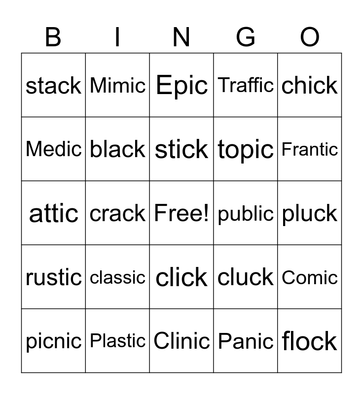 This bingo card has a free space and 28 words: Comic, tonic, topic, Panic, Medic, Epic, Mimic, rustic, public, picnic, attic, Traffic, Plastic, Clinic, Frantic, Skeptic, classic, black, stick, click, stack, block, flock, crack, pluck, cluck, chick and chuck.