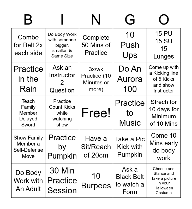 This bingo card has a free space and 24 words: Practice by Pumpkin, 30 Min Practice Session, 3x/wk Practice (10 Minutes or more), Do Body Work with An Adult, 15 PU 15 SU 15 Lunges, Combo for Belt 2x each side, Practice in the Rain, Do Body Work with someone bigger, smaller, & Same Size, Practice to Music, Have a Sit/Reach of 20cm, Do An Aurora 100, Teach Family Member Delayed Sword, Take a Pic Kick with Pumpkin, Come 10 Mins early do body work, Ask an Instructor 2 Question, Ask a Black Belt to watch a Form, Strech for 10 days for Minimum of 10 Mins, Complete 50 Mins of Practice, Come up with a Kicking line of 5 Kicks and show Instructor, Practice Count Kicks while watching show, Choose and Stance and Take a picture in your Halloween Costume, Show Family Member a Self-Defense Move, 10 Push Ups and 10 Burpees.