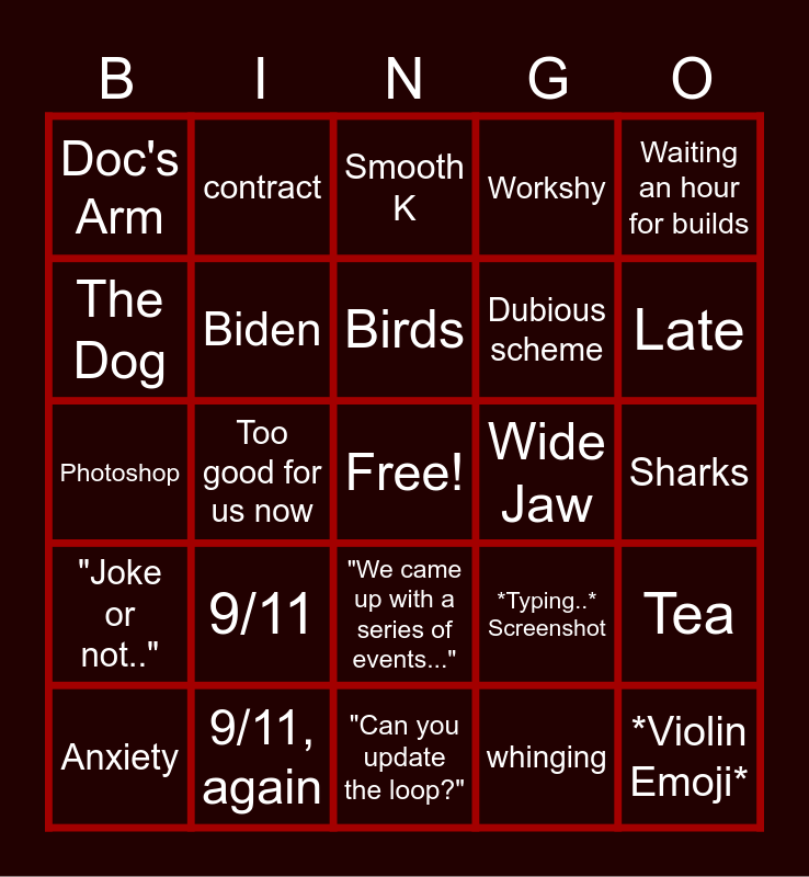 This bingo card has a free space and 38 words: Elon Musk, Star Wars, Trump, Biden, Tea, 9/11, Birds, Can't be trusted, Waiting an hour for builds, Dubious scheme, Too good for us now, Workshy, *Violin Emoji*, Sharks, The Dog, "Joke or not..", "Won't be settled this week", Smooth K, Gay Harry, Wide Jaw, Doc's Arm, 9/11, again, Late, Anxiety, guest appearance, "Can you update the loop?", No empathy, Flirting, Pwease, Drops controller, No need, decision is made :), "We came up with a series of events...", whinging, contract, Wet Glob, *Typing..* Screenshot, Photoshop and Cheating at Bingo.
