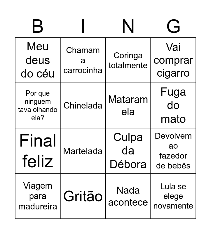 This bingo card has 16 words: Gritão, Devolvem ao fazedor de bebês, Coringa totalmente, Meu deus do céu, Final feliz, Chamam a carrocinha, Culpa da Débora, Nada acontece, Por que ninguem tava olhando ela?, Chinelada, Viagem para madureira, Vai comprar cigarro, Martelada, Fuga do mato, Mataram ela and Lula se elege novamente.