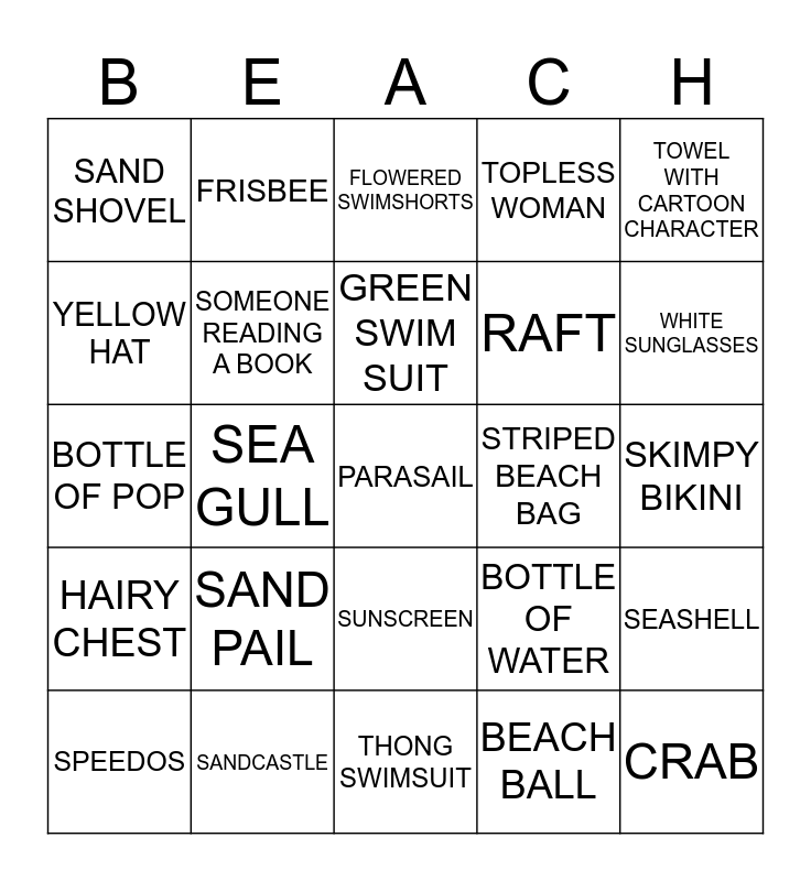 This bingo card has a free space and 24 words: SAND PAIL, SANDCASTLE, GREEN SWIM SUIT, SPEEDOS, TOWEL WITH CARTOON CHARACTER, SAND SHOVEL, YELLOW HAT, FRISBEE, STRIPED BEACH BAG, SUNSCREEN, RAFT, BOTTLE OF POP, BOTTLE OF WATER, SEASHELL, SOMEONE READING A BOOK, BEACH BALL, SKIMPY BIKINI, FLOWERED SWIMSHORTS, WHITE SUNGLASSES, SEA GULL, CRAB, HAIRY CHEST, TOPLESS WOMAN and THONG SWIMSUIT.