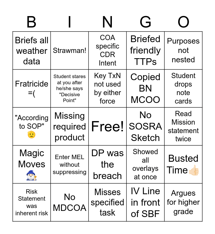 This bingo card has a free space and 24 words: Enter MEL without suppressing, No MDCOA, Key TxN not used by either force, Risk Statement was inherent risk, Purposes not nested, Briefs all weather data, Fratricide =(, Strawman!, No SOSRA Sketch, DP was the breach, Copied BN MCOO, "According to SOP" π«‘, Showed all overlays at once, Busted Timeππ», Student stares at you after he/she says "Decisive Point", IV Line in front of SBF, Read Mission statement twice, COA specific CDR Intent, Student drops note cards, Missing required product, Argues for higher grade, Magic Moves π§π»ββοΈ, Briefed friendly TTPs and Misses specified task.