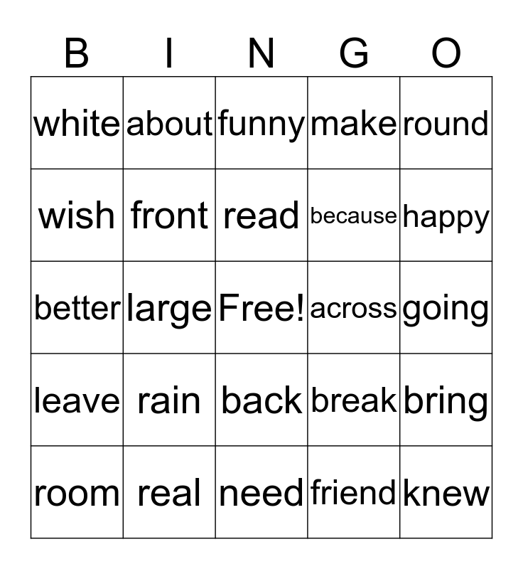 This bingo card has a free space and 24 words: rain, real, read, room, round, white, wish, about, across, back, because, better, break, bring, front, friend, going, funny, happy, large, knew, leave, make and need.