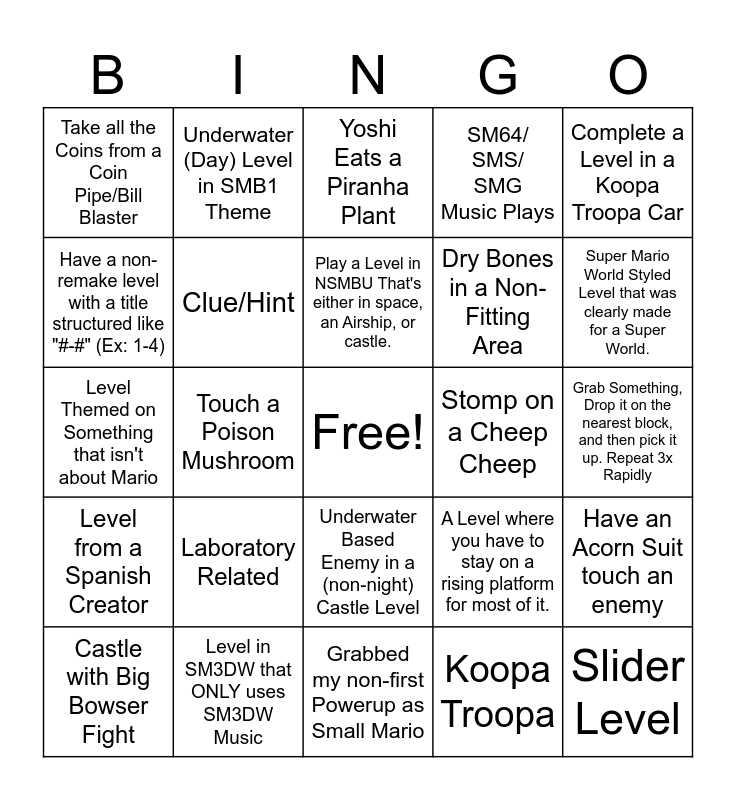 This bingo card has a free space and 24 words: Laboratory Related, Level in SM3DW that ONLY uses SM3DW Music, Play a Level in NSMBU That's either in space, an Airship, or castle., Castle with Big Bowser Fight, Complete a Level in a Koopa Troopa Car, Take all the Coins from a Coin Pipe/Bill Blaster, Have a non-remake level with a title structured like "#-#" (Ex: 1-4), Underwater (Day) Level in SMB1 Theme, Stomp on a Cheep Cheep, Underwater Based Enemy in a (non-night) Castle Level, Dry Bones in a Non-Fitting Area, Level Themed on Something that isn't about Mario, A Level where you have to stay on a rising platform for most of it., Have an Acorn Suit touch an enemy, Clue/Hint, Koopa Troopa, Grab Something, Drop it on the nearest block, and then pick it up. Repeat 3x Rapidly, Yoshi Eats a Piranha Plant, Super Mario World Styled Level that was clearly made for a Super World., Touch a Poison Mushroom, Slider Level, Level from a Spanish Creator, SM64/ SMS/ SMG Music Plays and Grabbed my non-first Powerup as Small Mario.