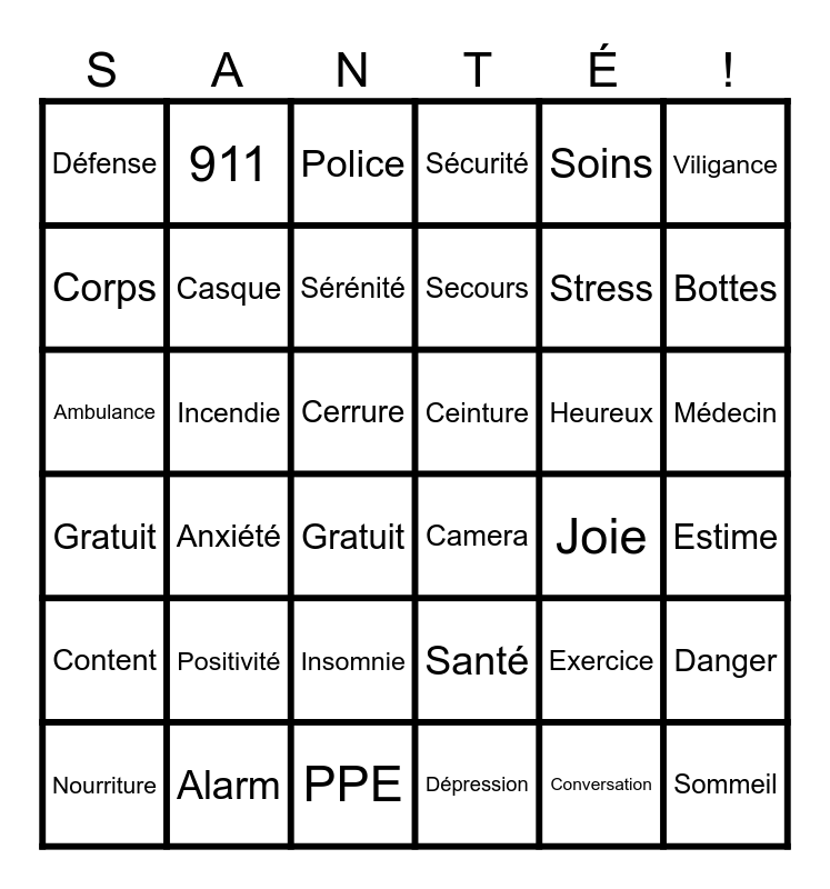This bingo card has 36 words: Santé, Insomnie, Dépression, Corps, Gratuit, Ceinture, Casque, PPE, Soins, Exercice, Bottes, Sécurité, Danger, Incendie, Secours, Défense, Content, Heureux, Ambulance, Police, Cerrure, Anxiété, Camera, Gratuit, Joie, 911, Stress, Alarm, Sérénité, Viligance, Sommeil, Nourriture, Estime, Médecin, Positivité and Conversation.