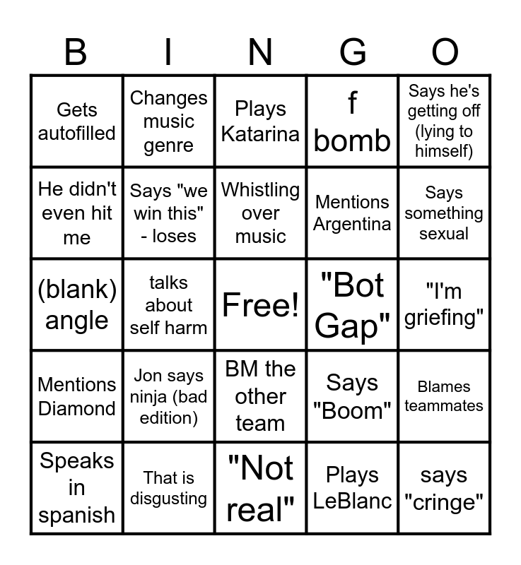 This bingo card has a free space and 24 words: Jon says ninja (bad edition), That is disgusting, Whistling over music, Speaks in spanish, Says he's getting off (lying to himself), Gets autofilled, He didn't even hit me, Changes music genre, "Bot Gap", BM the other team, Mentions Argentina, (blank) angle, Says "Boom", Blames teammates, Says "we win this" - loses, Plays LeBlanc, "I'm griefing", Plays Katarina, Says something sexual, talks about self harm, says "cringe", Mentions Diamond, f bomb and "Not real".