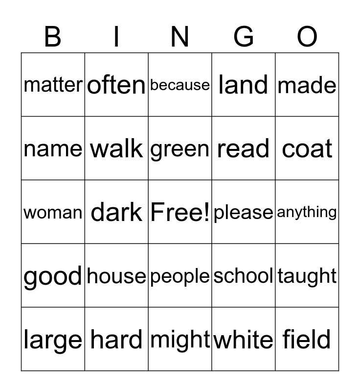 This bingo card has a free space and 24 words: house, hard, green, large, made, matter, name, often, please, people, read, woman, school, taught, walk, white, anything, because, coat, dark, field, good, land and might.