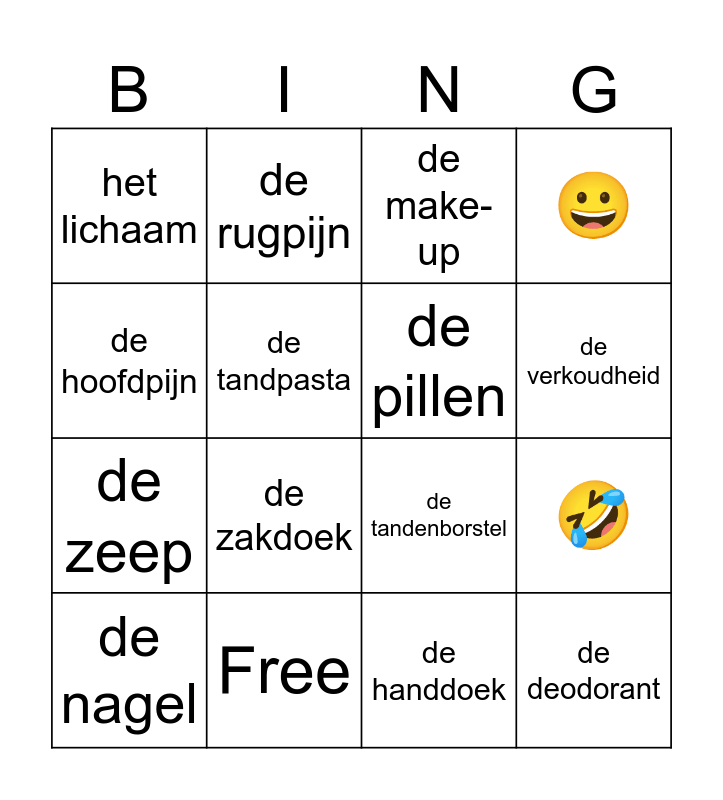 This bingo card has 18 words: de zakdoek, de deodorant, de make- up, het lichaam, de tandenborstel, 😀, de nagel, de rugpijn, de verkoudheid, de zeep, de handdoek, de hoofdpijn, 🤣, de tandpasta, de pillen, 😎, Free and Free.