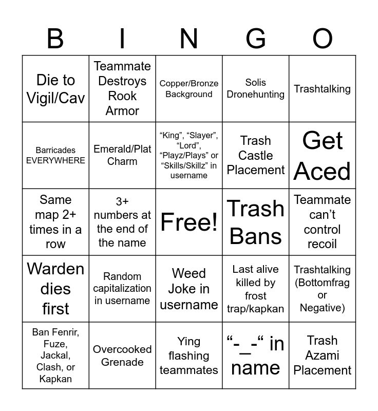 This bingo card has a free space and 32 words: “-_-“ in name, Unnecessary “x”, “y”, “z”, or “q” in username, 3+ numbers at the end of the name, Instalock Warden, Amaru, Ash Ace, Osa, Vigil or Solis, Warden dies first, Emerald/Plat Charm, Trashtalking, Trashtalking (Bottomfrag or Negative), Teammate Destroys Rook Armor, TK at start of round, “King”, “Slayer”, “Lord”, “Playz/Plays” or “Skills/Skillz” in username, Copper/Bronze Background, TK for Defuse, Vigil, Trash Bans, Pixelpeeking, Ban Fenrir, Fuze, Jackal, Clash, or Kapkan, Same map 2+ times in a row, Weed Joke in username, Random capitalization in username, Last alive killed by frost trap/kapkan, Site Cav/Vigil, Teammate can’t control recoil, Overcooked Grenade, Trash Azami Placement, Solis Dronehunting, Trash Castle Placement, Barricades EVERYWHERE, Die to Vigil/Cav, Ying flashing teammates, Die while droning as Iana/Echo and Get Aced.