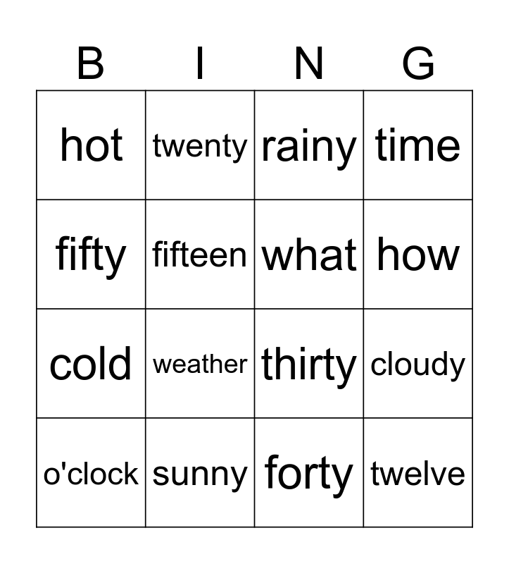 This bingo card has 16 words: sunny, cloudy, rainy, hot, cold, twenty, thirty, forty, fifty, fifteen, o'clock, time, weather, how, what and twelve.