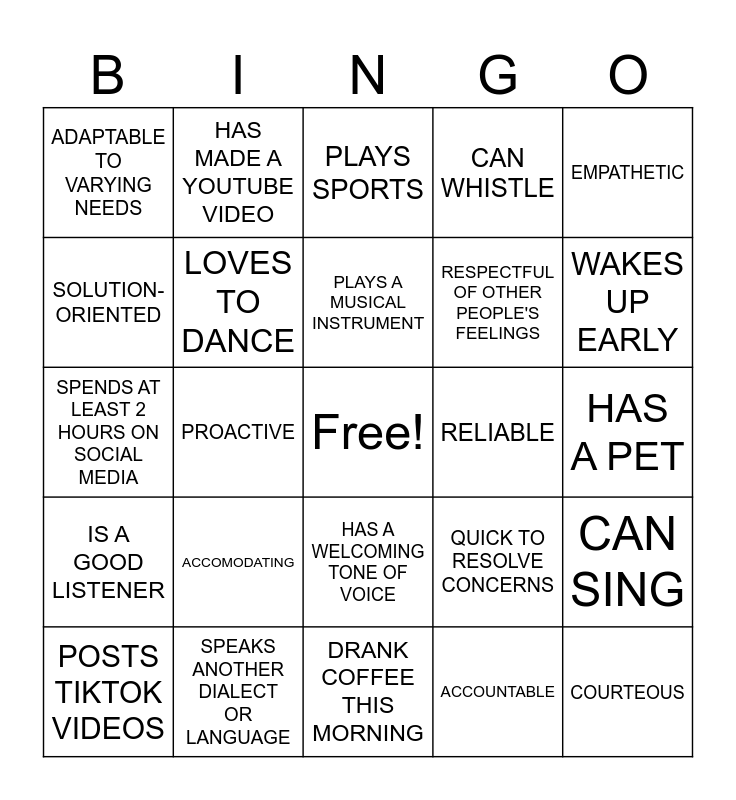 This bingo card has a free space and 25 words: ACCOMODATING, DRANK COFFEE THIS MORNING, PLAYS A MUSICAL INSTRUMENT, POSTS TIKTOK VIDEOS, EMPATHETIC, ADAPTABLE TO VARYING NEEDS, SOLUTION-ORIENTED, HAS MADE A YOUTUBE VIDEO, RELIABLE, HAS A WELCOMING TONE OF VOICE, RESPECTFUL OF OTHER PEOPLE'S FEELINGS, SPENDS AT LEAST 2 HOURS ON SOCIAL MEDIA, QUICK TO RESOLVE CONCERNS, CAN SING, LOVES TO DANCE, POLITE, HAS A PET, PLAYS SPORTS, WAKES UP EARLY, PROACTIVE, COURTEOUS, SPEAKS ANOTHER DIALECT OR LANGUAGE, IS A GOOD LISTENER, CAN WHISTLE and ACCOUNTABLE.