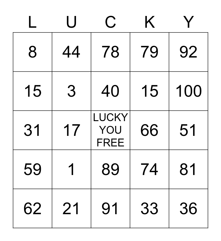 This bingo card has a free space and 24 words: 1, 21, 40, 62, 92, 8, 15, 44, 66, 89, 15, 31, 74, 81, 3, 33, 51, 78, 100, 17, 36, 59, 79 and 91.
