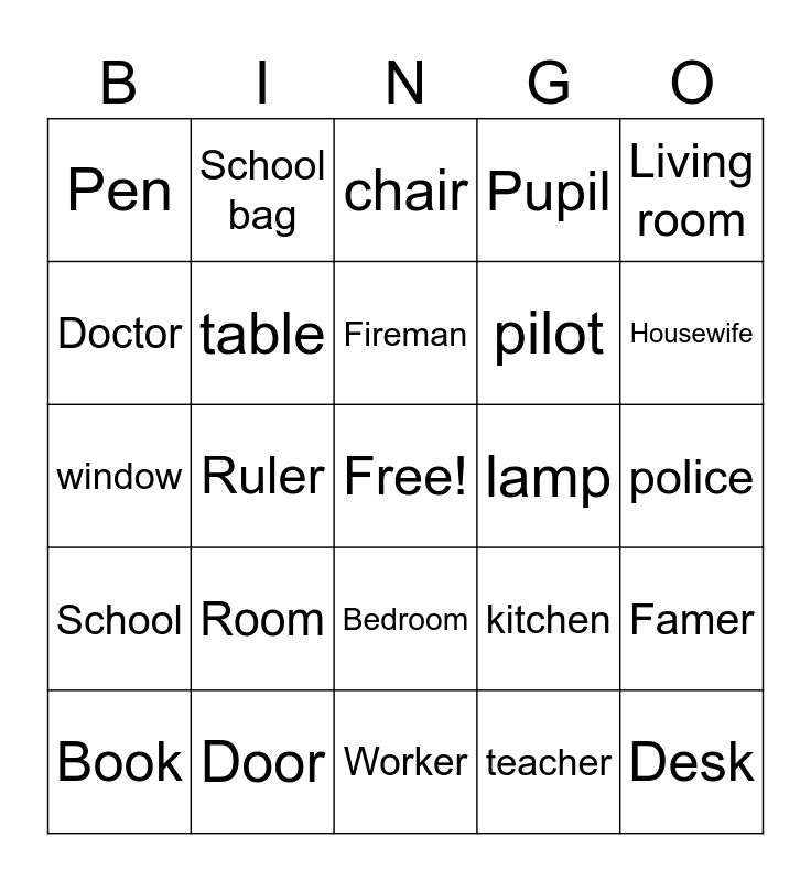 This bingo card has a free space and 24 words: Room, Door, Fireman, Book, Living room, Pen, Doctor, School bag, lamp, Bedroom, pilot, window, kitchen, Famer, table, teacher, police, chair, Housewife, Ruler, Desk, School, Pupil and Worker.