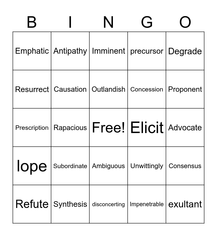 This bingo card has a free space and 24 words: Subordinate, Synthesis, Outlandish, Refute, Degrade, Emphatic, Resurrect, Antipathy, Elicit, Ambiguous, Concession, Prescription, Unwittingly, Consensus, Causation, Impenetrable, Advocate, Imminent, Proponent, Rapacious, exultant, lope, precursor and disconcerting.