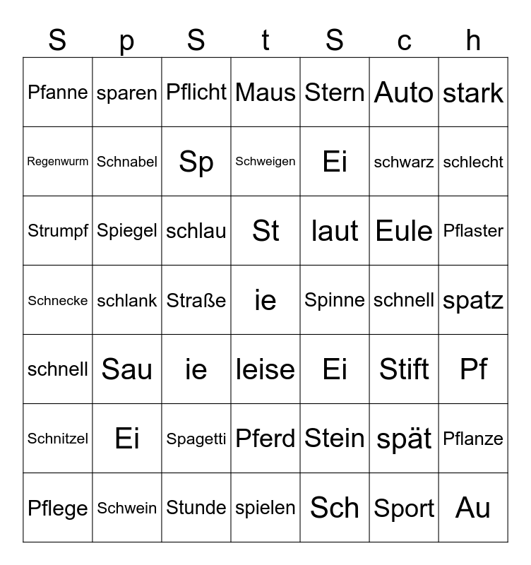 This bingo card has a free space and 48 words: Stein, schwarz, spielen, schlank, schlau, spatz, sparen, Schwein, Auto, leise, stark, Maus, Eule, laut, Schnitzel, schnell, Regenwurm, schlecht, spät, Stern, Ei, Straße, Pfanne, Schnabel, Pflanze, Sp, Pflaster, Pflege, St, Spiegel, Sport, Spinne, Pf, Ei, Schnecke, Ei, Stift, Strumpf, ie, Spagetti, schnell, Au, Pflicht, Stunde, Schweigen, Pferd, Sau and Sch.