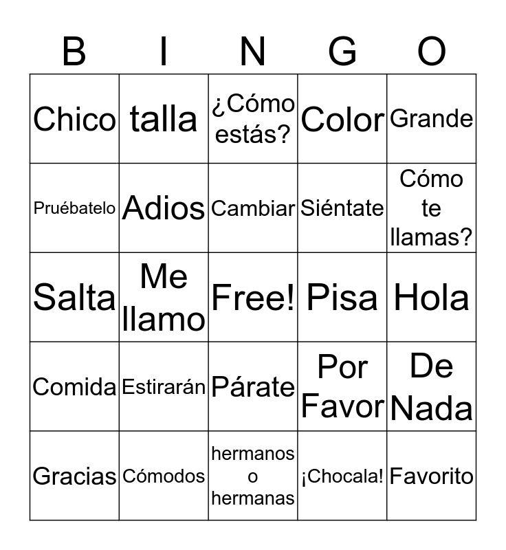This bingo card has a free space and 24 words: Estirarán, Cómodos, Cambiar, Gracias, Grande, Chico, Pruébatelo, talla, Pisa, Párate, Siéntate, Salta, Por Favor, De Nada, Adios, ¡Chocala!, Hola, ¿Cómo estás?, Cómo te llamas?, Me llamo, Favorito, Comida, Color and hermanos o hermanas.