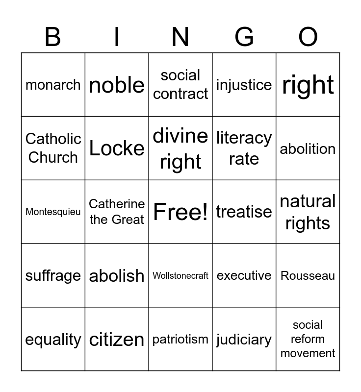 This bingo card has a free space and 24 words: abolish, citizen, divine right, equality, right, monarch, Catholic Church, noble, treatise, Wollstonecraft, literacy rate, Montesquieu, executive, Rousseau, Locke, judiciary, natural rights, social contract, abolition, Catherine the Great, social reform movement, suffrage, injustice and patriotism.